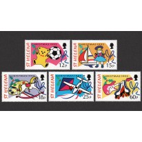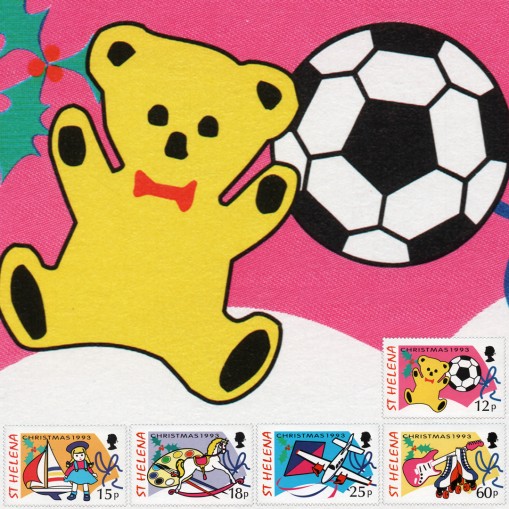 Na znaczkach widnieją zabawki dziecięce: pluszowy miś i piłka, jacht i lalka, paleta z farbami i koń na biegunach, latawiec i samolot oraz gitara i wrotki.