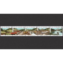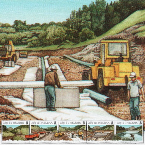 Na znaczkach widnieją kolejno: przygotowanie terenu, transport ziemi, układanie rur, umacnianie zapory oraz widok utworzonego przez zaporę sztucznego jeziora w 1994 roku.
