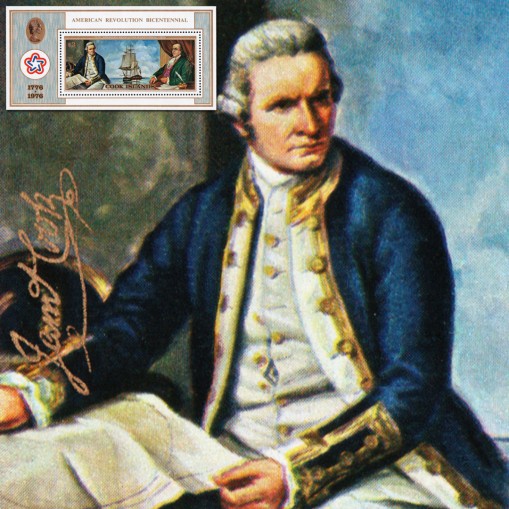 Na znaczku widnieją kapitan James Cook i Benjamin Franklin.