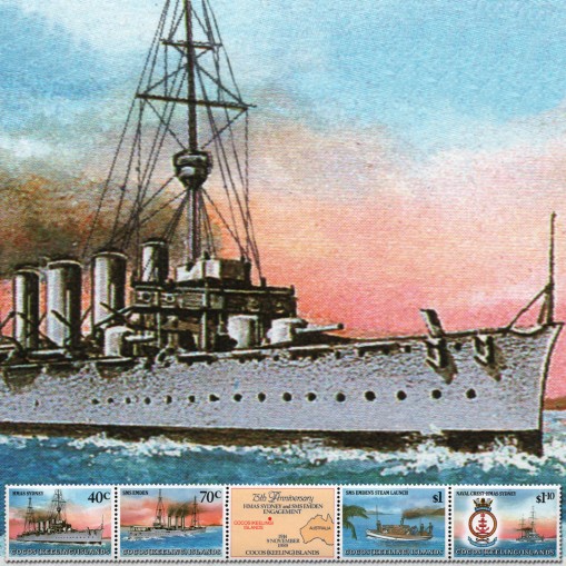 Na znaczkach widnieją kolejno: krążownik australijski HMAS „Sydney”, krążownik niemiecki SMS „Emden”, łódź z okrętu „Emden” oraz okręt „Sydney” wraz z herbem.
