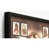 Elegancka, innowacyjna i niezmiernie efektowna wizualnie metoda prezentacji znaczków - kompletna seria wyeksponowana na planszy z ilustracją i oprawiona w ramę.