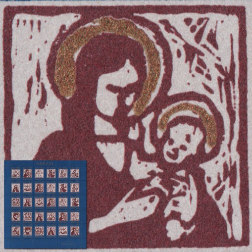 Na znaczkach widnieją drzeworyty przedstawiające stajenkę betlejemską, Dzieciątko w żłobie, Madonnę z Dzieciątkiem, Józefa, anioła i Trzech Króli.