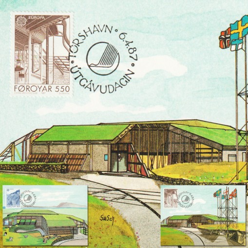 Znaczki na kartach maksimum z emisji EUROPA CEPT z 1987 roku, której tematem przewodnim była architektura współczesna.