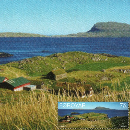 Na znaczku z Wysp Owczych widnieje wybrzeże i wioska Hoyvik na wyspie Streymoy.