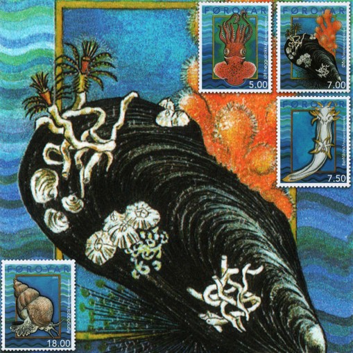 Na znaczkach widnieją następujące gatunki mięczaków zamieszkujące wody u wybrzeży Wysp Owczych: