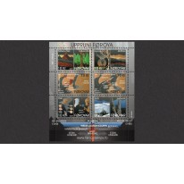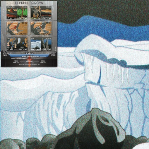 Znaczki w bloku ilustrujące procesy geologiczne, wskutek których powstały Wyspy Owcze, kolejno: