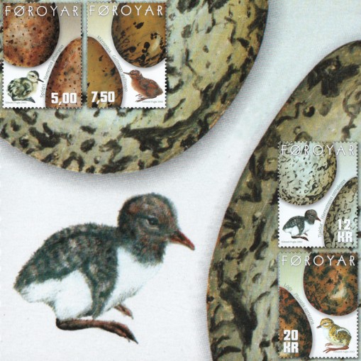 Na znaczkach widnieją jaja i pisklęta następujących gatunków ptaków zamieszkujących Wyspy Owcze: