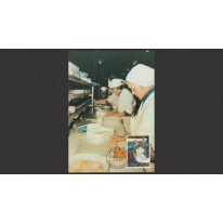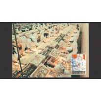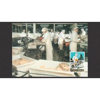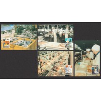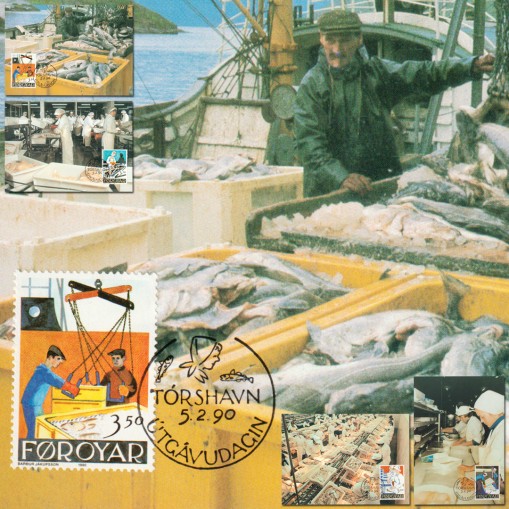 Znaczki na kartach maksimum, na których przedstawiono proces przetwórstwa ryb, od wyładunku z kutrów rybackich, poprzez czyszczenie i filetowanie, aż po pakowanie.