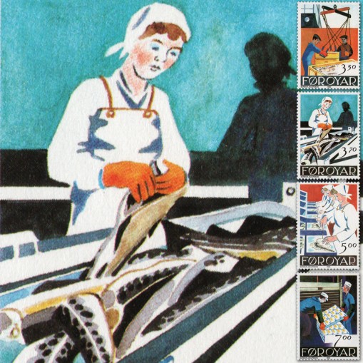 Na znaczkach przedstawiono proces przetwórstwa ryb, od wyładunku z kutrów rybackich, poprzez czyszczenie i filetowanie, aż po pakowanie.