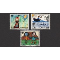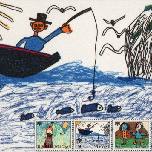 Na znaczkach widnieją rysunki dzieci przedstawiające kolejno: dziewczynkę w odświętnym stroju, mężczyznę na łodzi łowiącego ryby i dwóch przyjaciół.