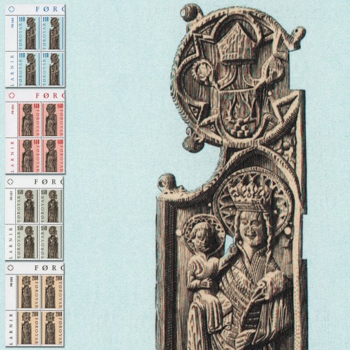 Na znaczkach widnieją rzeźbione drewniane ławy z kościoła św. Olafa w Kirkjobøur. Rzeźby te przedstawiają kolejno: Madonnę z Dzieciątkiem, Jana Chrzciciela, świętego Piotra i świętego Pawła.