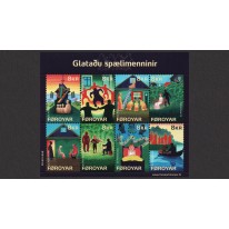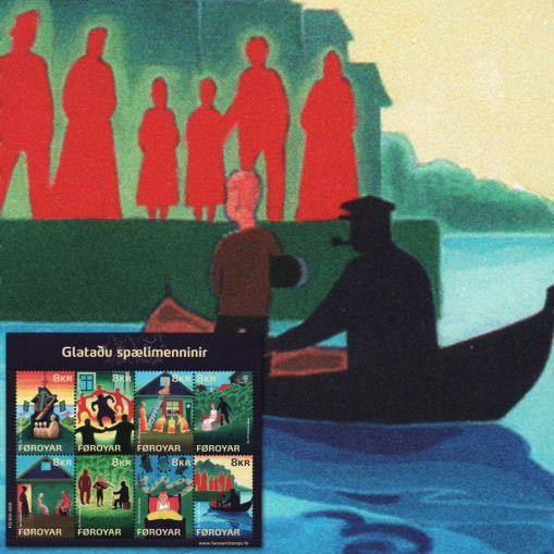 Znaczki w bloku, na których widnieją ilustracje powieści farerskiego pisarza Williama Heinesena (1900-1991) pod tytułem „Zagubieni grajkowie” (oryg. „De fortabte spillemænd”).