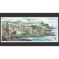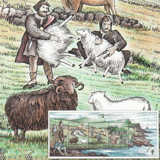 Znaczki w bloku, na których widnieje codzienne życie na Wyspach Owczych za czasów panowania Wikingów. Na znaczkach widnieją kolejno: wypas i strzyżenie owiec, zbieranie siana i dojenie krów.