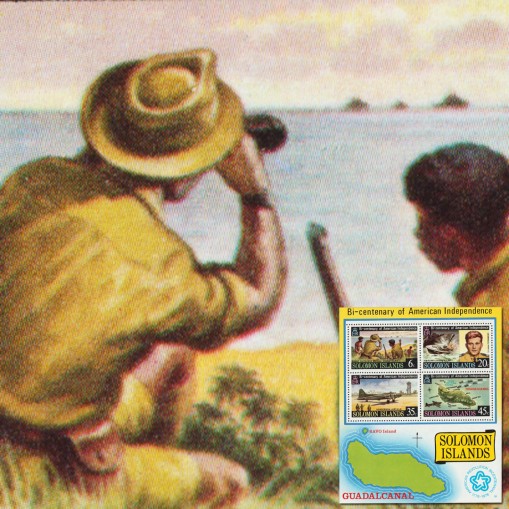 Na znaczkach widnieją sceny zaangażowania USA w walki na południowym Pacyfiku w czasie drugiej wojny światowej, kolejno:
