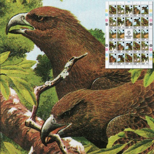 Znaczki w arkuszu, na których widnieje bielik melanezyjski (Haliaeetus sanfordi).