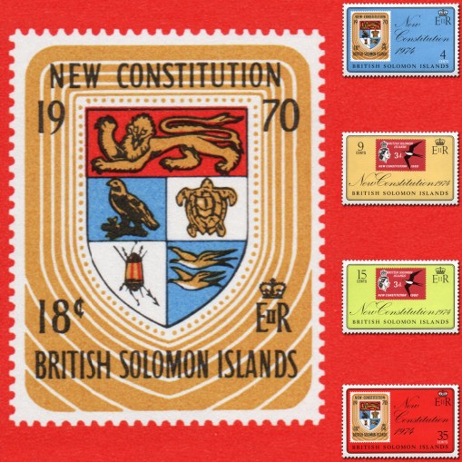 Na walorach widnieją znaczki wydane na Wyspach Salomona w 1970 roku (przedstawiający herb Wysp) i w 1961 roku (przedstawiający ptaka - fregatę wielką) - oba upamiętniające przyjęcie nowej konstytucji.