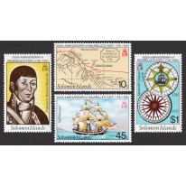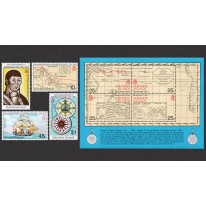 Znaczki i blok upamiętniające dwusetną rocznicę podróży hiszpańskiego odkrywcy Francisco Antonio Mourelle’a, który żeglował po Pacyfiku w poszukiwaniu południowej drogi z Filipin do Meksyku.