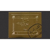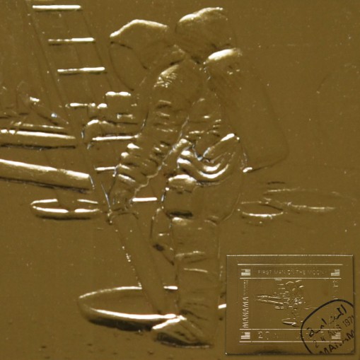 Złoty znaczek upamiętniający drugą rocznicę lądowania człowieka na Księżycu.