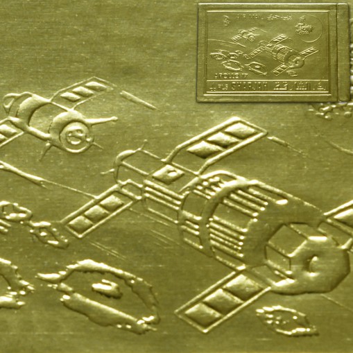 Na znaczku widnieje połączenie się statków kosmicznych Sojuz i Apollo.