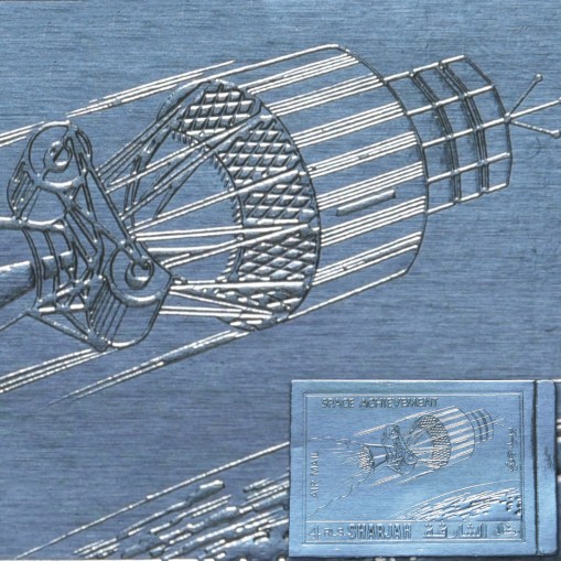 Srebrny znaczek upamiętniający postępy w badaniu przestrzeni kosmicznej.